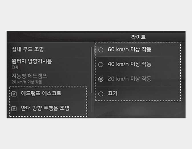시동 'ON' 상태에서 인포테인먼트 시스템의 '설정 → 차량 설정 → 라이트 → 지능형 헤드램프'에서 원하는 속도를 선택하면 기능이 켜집니다.