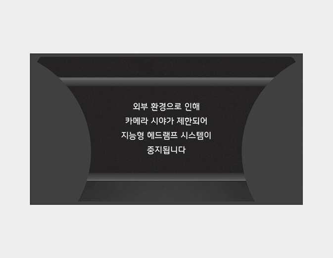 전방 카메라가 이물질로 오염되어 작동 중이던 지능형 헤드램프 시스템이 일시적으로 중지되면 계기판에 경고문을 표시합니다(일정 시간 후 꺼짐). 이 경우 시스템 고장이 아닙니다. 주변에 묻은 이물질을 제거하면 시스템은 다시 정상적으로 작동합니다. 단, 시동을 건 직후에 전방 카메라 전면이 오염되었거나 감지되는 물체가 없는 경우에는 시스템이 정상적으로 작동하지 않을 수 있습니다.