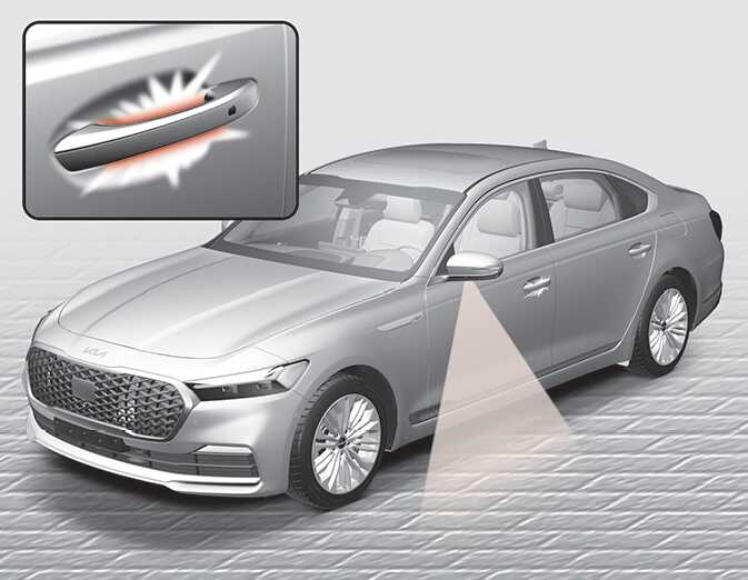 웰컴 시스템 (사양 적용시) ORJ041030 차량 주위를 조명하여 야간 안전성 향상을 위한 장치입니다. 인포테인먼트 시스템의 '설정 → 차량 설정 → 편의 → 웰컴 미러/라이트'에서 기능을 설정할 수 있습니다.