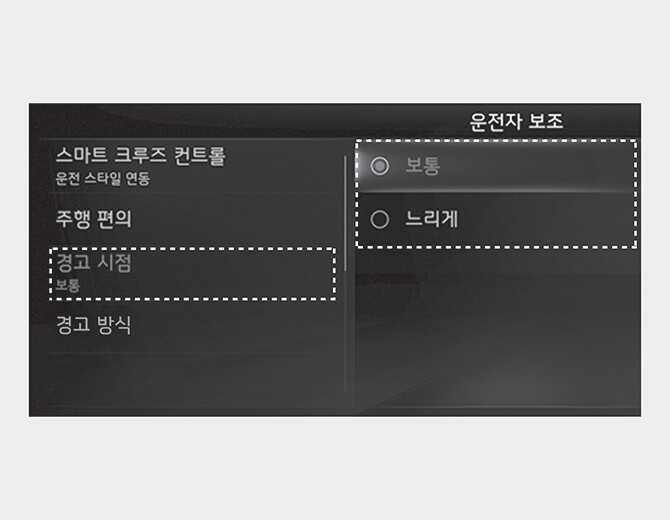 경고 방식을 변경하면 다른 운전자 보조 시스템의 경고 방식도 같이 변경될 수 있습니다. 고려하여 변경하십시오.