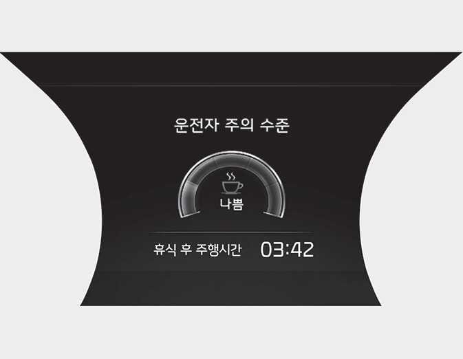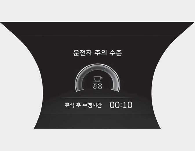 계기판에 운전자 주의 수준이 5단계로 표시됩니다. 운전자가 부주의 운전을 하거나 휴식 없이 장시간 운전할 경우 단계가 감소합니다.