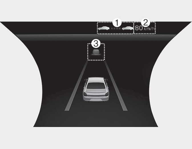 작동 상태 ①: 전방 차량 유무 및 설정된 차간거리 단계 ②: 설정속도 ③: 전방 차량 유무 및 목표 차간거리