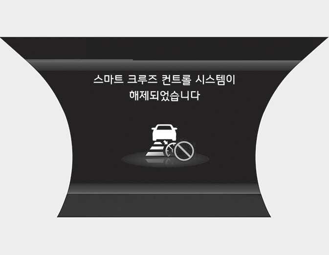 스마트 크루즈 컨트롤이 자동으로 일시 해제되면 경고문과 경고음을 통해 자동 일시 해제를 알립니다.
