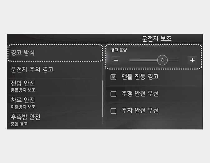 경고 방식을 변경하면 다른 운전자 보조 시스템의 경고 방식도 같이 변경될 수 있습니다. 고려하여 변경하십시오.