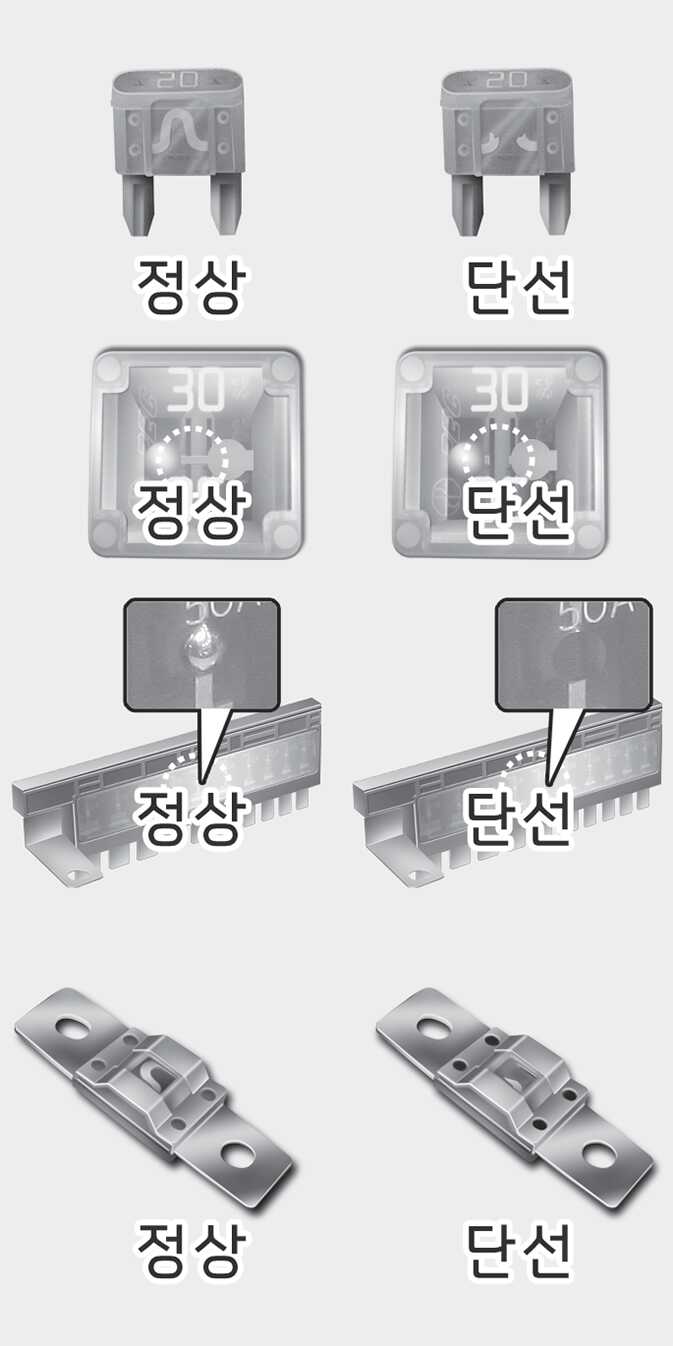 차량의 전기장치는 전기 과부하를 방지하기 위해 퓨즈가 설치되어 있으므로 전기 장치가 작동되지 않으면 우선 퓨즈 단선 여부를 점검하십시오.