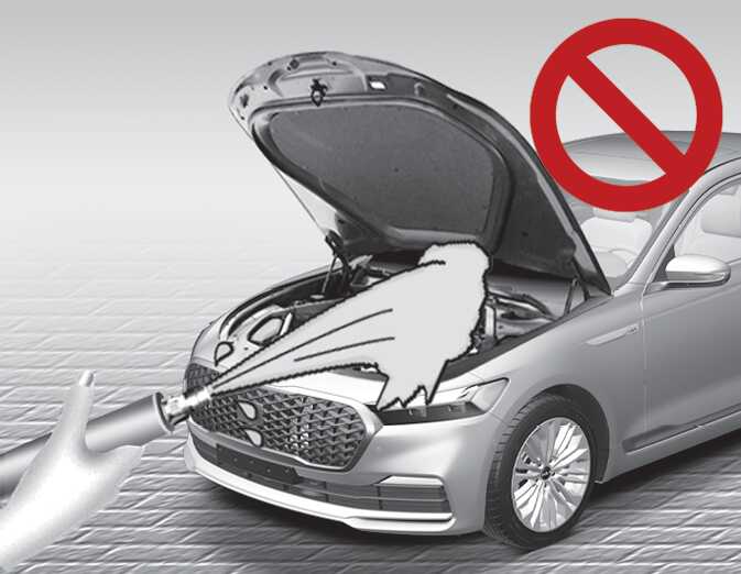 • 엔진룸내를 물로 닦으면(또는 고압세차)엔진룸내 있는 전기회로 또는 에어덕트로 물이 유입되어 정상적인 차량운행이 불가능할 수 있습니다.