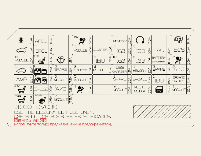 Μπλοκ διακλάδωσης ICU (Ρελέ μανδάλωσης μακράς διάρκειας φορτίου, ασφάλεια: IAU, ECS, BATTERY MANAGEMENT, AIR BAG2, MEMORY1, SPARE3 (B+), A/C2, E-CALL, IBU1, BRAKE SWITCH, MULTIMEDIA, DOOR LOCK, MODULE1) |