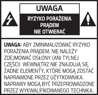 Aby zmniejszyć ryzyko porażenia prądem, nie zdejmować pokrywy ani tylnej części urządzenia. Wewnątrz nie znajdują się żadne elementy, które mogą zostać naprawione przez użytkownika. Wezwać wykwalifikowany personel serwisowy.