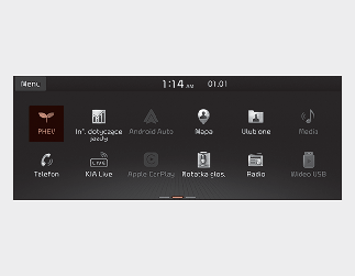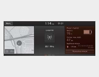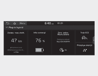 Menu trybu hybrydowego plug-in składa się z pięciu części: [EV range] (Zasięg EV), [Energy information] (Informacje o zużyciu energii), [Charge management] (Sterowanie ładowaniem), [ECO driving] (Jazda w trybie ECO), [Energy flow] (Przepływ energii).