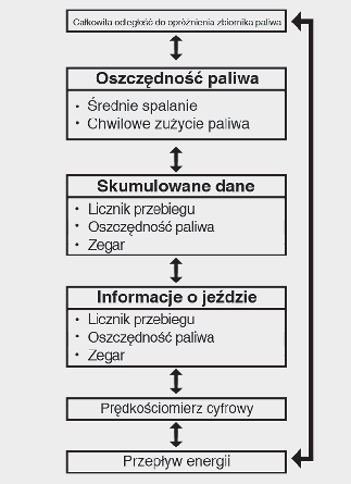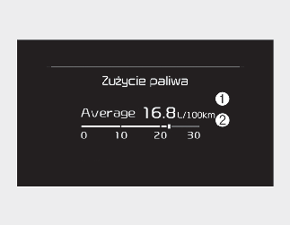 Zakres wskazań zużycia paliwa: od 0,0 do 30 km/l, l/100 km lub od 0,0 do 50,0 MPG