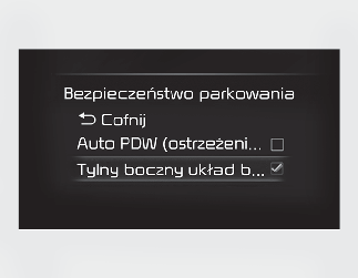 Po włączeniu zapłonu przyciskiem ENGINE START/STOP (włączenie/wyłączenie silnika) zaznaczyć opcję „User Settings (Ustawienia użytkownika) → Driver Assistance (Wspomaganie kierowcy) → Parking Safety (Bezpieczeństwo podczas parkowania)” na wyświetlaczu LCD lub w systemie multimedialnym, aby wybrać funkcje, które mają działać.