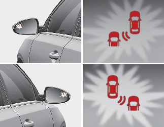 Aby ostrzec kierowcę o pojeździe nadjeżdżającym z lewej/prawej strony za pojazdem, kontrolka na zewnętrznym lusterku wstecznym będzie migać i w zestawie wskaźników zostanie wyświetlone ostrzeżenie. W tym samym czasie zostanie wyemitowany ostrzegawczy sygnał dźwiękowy. Podczas działania monitora widoku wstecznego ostrzeżenie pojawi się również na ekranie systemu multimedialnego.
