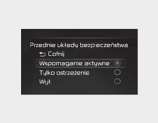 Po włączeniu zapłonu przyciskiem ENGINE START/STOP (włączenie/wyłączenie silnika) zaznaczyć opcję „User Settings (Ustawienia użytkownika) → Driver Assistance (Wspomaganie kierowcy) → Forward Safety (Unikanie kolizji z przodu)” na wyświetlaczu LCD lub w systemie multimedialnym, aby wybrać funkcje, które mają działać.