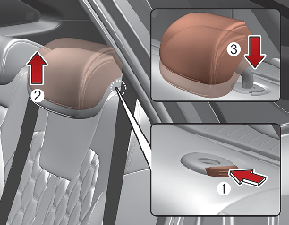 Um die Kopfstütze in eine höhere Stellung zu bringen, ziehen Sie sie bis in die gewünschte Stellung nach oben (1). Um die Kopfstütze in eine tiefere Stellung zu bringen, drücken Sie die Sperrtaste (3) an der Kopfstützenaufnahme, halten Sie die Taster gedrückt und drücken Sie dabei die Kopfstütze bis in die gewünschte Stellung nach unten (2).