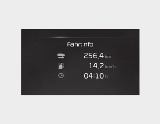 Dieser Bildschirm zeigt die Fahrstrecke, den Durchschnittsverbrauch und die Gesamtfahrzeit.