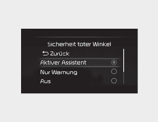 Wählen Sie, wenn der Start/Stop-Knopf in Position ON steht, im Einstellungsmenü die Option „Fahrerassistenz → Warnungszeitpunkt“, um die Warnungsaktivierungszeit für den Totwinkel-Kollisionsvermeidungsassistenten zu ändern.