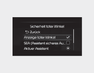 Wählen Sie, wenn der Motorstart/Stopp-Knopf in Position ON steht, im Einstellungsmenü die Option „Fahrerassistenz → Totwinkel-Sicherheit → Totwinkelansicht“ , um den Totwinkel-Monitor einzuschalten bzw. um das System wieder auszuschalten.