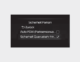 Wenn der ENGINE START/STOP-Knopf in Position ON steht, wählen Sie im Einstellungsmenü „Fahrerassistenz → Parksicherheit → Sicherheit Querverkehr hinten“, um den hinteren Querverkehrs-Kollisionsvermeidungsassistenten einzuschalten bzw. die Funktion zu deaktivieren.