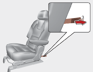 Si le commutateur de rabattement (1 ou 2) de la 2ème rangée (dans la partie supérieure du dossier de la 2ème rangée ou dans la partie extérieure du siège) ne fonctionne pas, tirer la sangle (3) en bas à gauche du siège de la 2ème rangée. Il fonctionne de la même façon que le commutateur de rabattement et vous pouvez déplacer le siège vers l'avant en même temps que le dossier du siège.