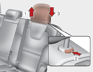 Pour abaisser l'appuie-tête, pousser et maintenir le bouton de déverrouillage (2) enfoncé sur le support d'appuie-tête et abaisser l'appuie-tête à la position voulue (3).