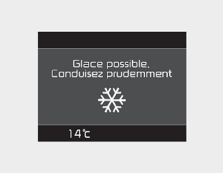 Si le témoin d’avertissement de route verglacée s'allume pendant la conduite, vous devez conduire plus attentivement et éviter les excès de vitesse, l’accélération rapide, le freinage brusque ou les virages serrés.
