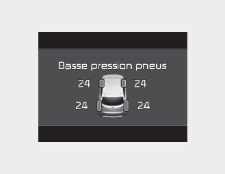Ce message d'avertissement s'affiche si la pression des pneus est basse. Le pneu correspondant sur le véhicule s'allume.