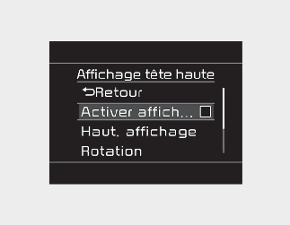 Si l'image du HUD n'est pas bien affichée, réglez la hauteur, l'angle de rotation ou l'éclairage du HUD dans le bloc d'instruments.