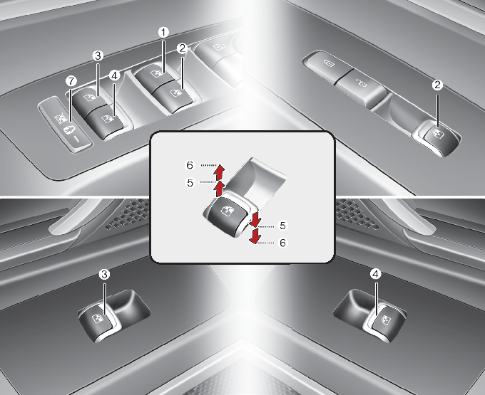 Chaque porte possède un commutateur de vitre à commande électrique qui commande la vitre de porte. Le conducteur dispose d'un commutateur de verrouillage des vitres à commande électrique qui peut bloquer le fonctionnement des vitres des passagers arrière. Les vitres à commande électrique peuvent être actionnées pendant environ 10 secondes après avoir mis le bouton ENGINE START/STOP (démarrage / arrêt du moteur) en position ON (marche). Toutefois, si les portes avant sont ouvertes, les vitres à commande électrique ne peuvent pas être actionnées, même pendant la période de 10 secondes.