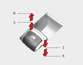 Une pression ou un relevage momentané du commutateur de vitre électrique jusqu'au deuxième cran (6) abaisse ou relève complètement la vitre même une fois que le commutateur est relâché. Pour arrêter la vitre à la position désirée lorsqu'elle est en fonctionnement, tirer ou appuyer sur l'interrupteur et le relâcher.