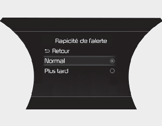 À la livraison du véhicule, le minutage de l’avertissement est réglé sur « Normal ». Si vous modifiez le minutage de l’avertissement, le délai de d’avertissement des autres systèmes d’assistance à la conduite peut changer.