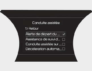 Si la fonction « Alerte de départ du véhicule de tête » est sélectionnée à ’partir de la section « Aide à la conduite → Aide à la conduite », cette fonction informe le conducteur lorsque le véhicule avant quitte l’arrêt.