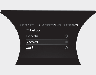 Il est possible de régler la sensibilité de la vitesse du véhicule lorsque l’on suit un véhicule qui précède pour maintenir la distance définie. Rendez-vous dans les « Paramètres utilisateur → Assistance à la conduite → Réaction du SCC → Rapide/Normal/Lent ». Vous pouvez sélectionner le niveau que vous préférez parmi les trois.