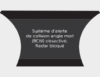 Si cela se produit, le message d’avertissement « Blind-Spot Collision Warning (BCW) system disabled. Radar blocked » (Système d’alerte de collision d’angle mort (BCW) désactivé. Radar bloqué) s’affiche sur le tableau de bord. Il ne s’agit pas d’un dysfonctionnement.