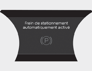 Si vous essayez de démarrer en appuyant sur la pédale d’accélérateur avec le frein de stationnement électronique enclenché, mais que le frein de stationnement électronique ne se relâche pas automatiquement, un avertissement retentit et un message apparaît.