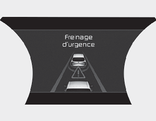 Pour avertir le conducteur de l’application automatique du freinage d’urgence, le message d’avertissement « Emergency Braking » (Freinage d’urgence) s’affichera sur le tableau de bord, un signal sonore retentira et le volant vibrera.