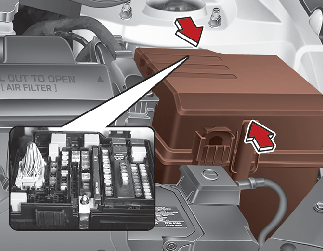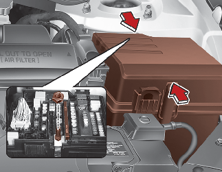 Toujours reposer soigneusement le cache du tableau à fusibles dans le compartiment moteur, pour le protéger des pannes électriques qui peuvent se produire après un contact avec de l'eau. Écouter le bruit de déclic pour s'assurer que le cache du tableau à fusibles est bien fixé.