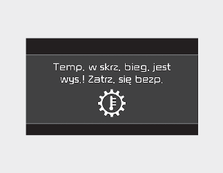 Jeśli to ostrzeżenie zostanie zignorowane, płynność jazdy może się pogorszyć. Może to spowodować nagłe zmiany biegów, regularne zmiany biegów lub szarpnięcia. Aby powrócić do normalnego trybu jazdy, należy zatrzymać pojazd i wcisnąć hamulec nożny lub zmienić pozycję skrzyni biegów na P (parkowanie).