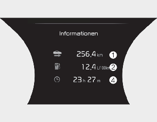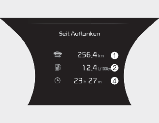 Dieser Bildschirm zeigt die Gesamtfahrstrecke (1), den Durchschnittsverbrauch (2) und den aktuellen Verbrauch (3) und die Gesamtfahrzeit (4) nach dem Auftanken.
