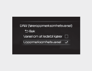 Med ENGINE START/STOP (start/stopp-knappen) i ON, velg eller fravelg 'Førerassistanse → Advarsel for førerens oppmerksomhet' fra menyen Innstillinger for å velge hvorvidt hver funksjon skal brukes.