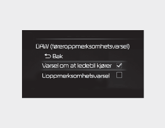 Hvis 'Varsel for uoppmerksom kjøring' er valgt vil funksjonen informere føreren om førerens oppmerksomhetsnivå og vil anbefale å ta en pause når nivået faller under et visst nivå.