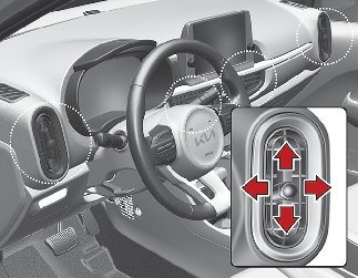 氣流可以流向足部、儀表板出風口或擋風玻璃。五個符號用於表示臉部、雙模式、足部、足部-除霧和除霧空氣位置。