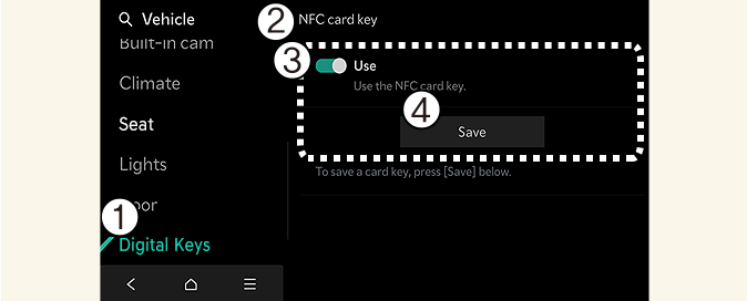 Когато автомобилът е включен, на инфотейнмънт системата докоснете Setup (Настройки) → Vehicle (Автомобил) → Digital Keys (Цифрови ключове) → NFC Card key (Ключ за NFC карта) → Use (Използвай).