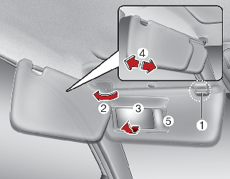 선바이저 안쪽의 커버 (3, 사양 적용 시)를 밀면 거울이 있습니다. 거울 사용 시 선바이저를 내린 후 커버(3)를 위로 올리십시오. 이때, 조명이 작동되며 사용 후 커버를 내리면 꺼집니다.
