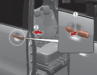 슬라이딩 도어는 바깥 손잡이(1)를 잡아 당긴 후, 도어를 차량 뒷방향(2)으로 밀어 여십시오. 당기지 않고 뒷방향으로 밀면 열리지 않습니다.