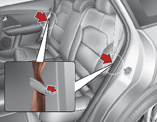 Când pliați bancheta spate, introduceți catarama centurii spate în buzunarul dintre spătarul banchetei spate și pernă, apoi asigurați-vă că ambele centuri de siguranță nu interferează cu bagajele și încărcătura stivuită. Apoi, introduceți centura de siguranță în cele două ghidaje ale elementelor (sau suportul), aflate pe ambele părți.