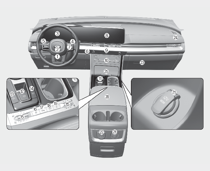 * 실제 차량과 다를 수 있습니다. (스위치의 형상 및 배열은 사양 적용에 따라 달라질 수 있습니다.)