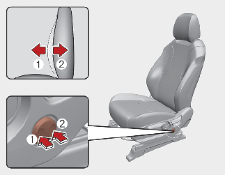 조절 스위치의 앞부분(1)을 누르면 등받이 허리 지지 부분이 앞으로 튀어나오고, 스위치의 뒷부분(2)을 누르면 허리 지지 부분이 뒤로 들어갑니다.