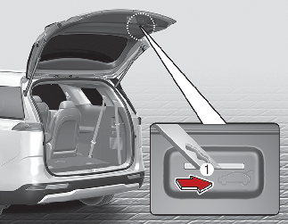 키 등을 이용하여 그림과 같이 테일게이트 내부에 있는 잠금해제 레버(1)를 화살표 방향으로 밀어 테일게이트를 잠금 해제하십시오.