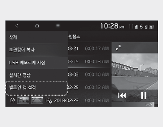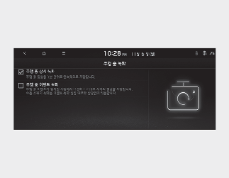 인포테인먼트 시스템 화면에서 [빌트인 캠] 진입 후, ‘메뉴 → 빌트인 캠 설정’ 화면에서 주행/주차 각각의 조건에 대한 상시와 이벤트의 녹화 기능 활성화 및 이벤트 감지 민감도 등을 설정할 수 있습니다.