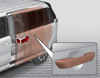 파워 슬라이딩 도어를 닫을 때는 바깥 손잡이(1)를 당기거나 바깥 손잡이 버튼 (3)을 누르면, 도어가 자동으로 닫힙니다. (사양 적용 시)